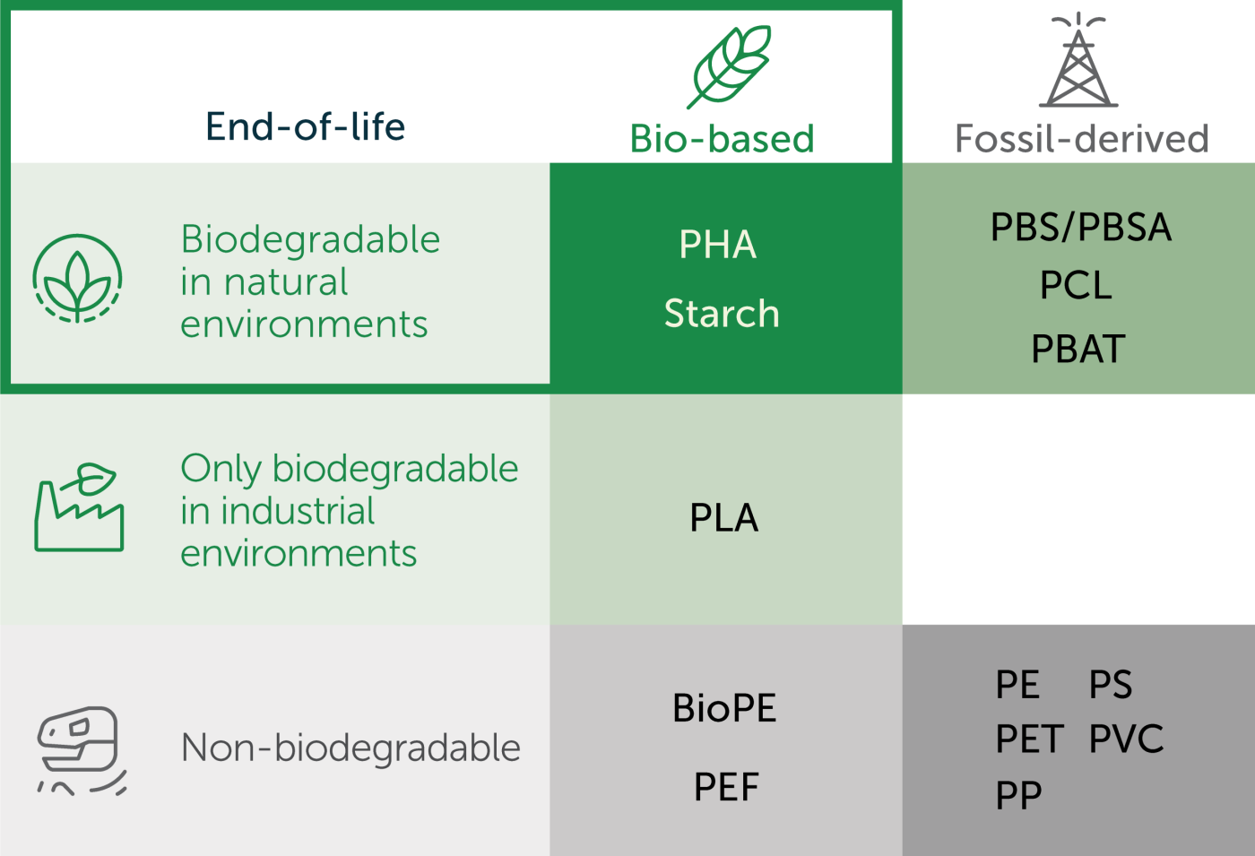 The terms ‘bioplastic’ refers to a broad group of polymer materials that are at least partly bioderived and/or biodegradable. But biodegradable and bio-derived are two different, and independent, classifications. Some fossil-derived plastics, such as PBAT, are biodegradable; some bio-derived plastics, such as bioPE, are non-biodegradable; plastics like PHA, TPS, and PLA are both.